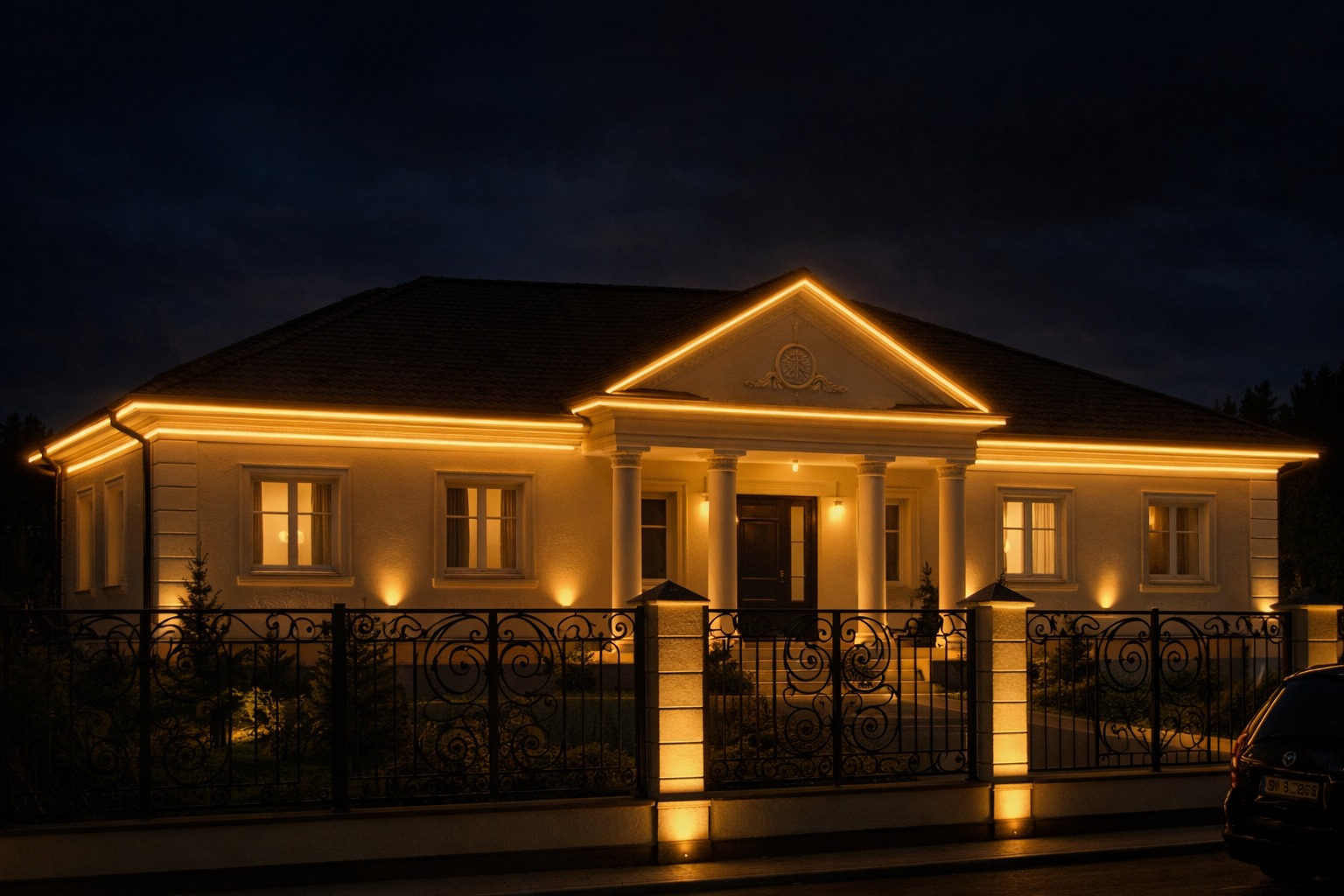 Выбор эффекта зависит от архитектурного стиля дома и того образа, который вы хотите создать. Классическая архитектура хорошо принимает симметричную градационную подсветку, современная минималистичная — контурную, а дом с выразительными деталями выигрывает от точечных акцентов.