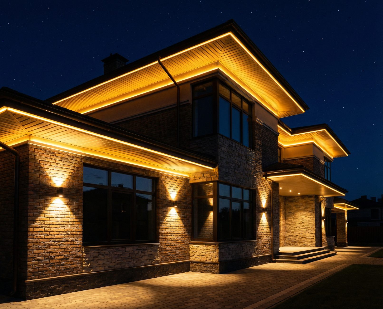 Стоимость зависит от размера фасада, сложности архитектуры, выбранного оборудования. В среднем базовая схема для одноэтажного дома обойдётся в 50–120 тысяч рублей, для двухэтажного с более сложной композицией — 150–300 тысяч рублей. Это включает светильники, монтаж, базовую систему управления. Премиальные решения с интеграцией в умный дом могут быть дороже.