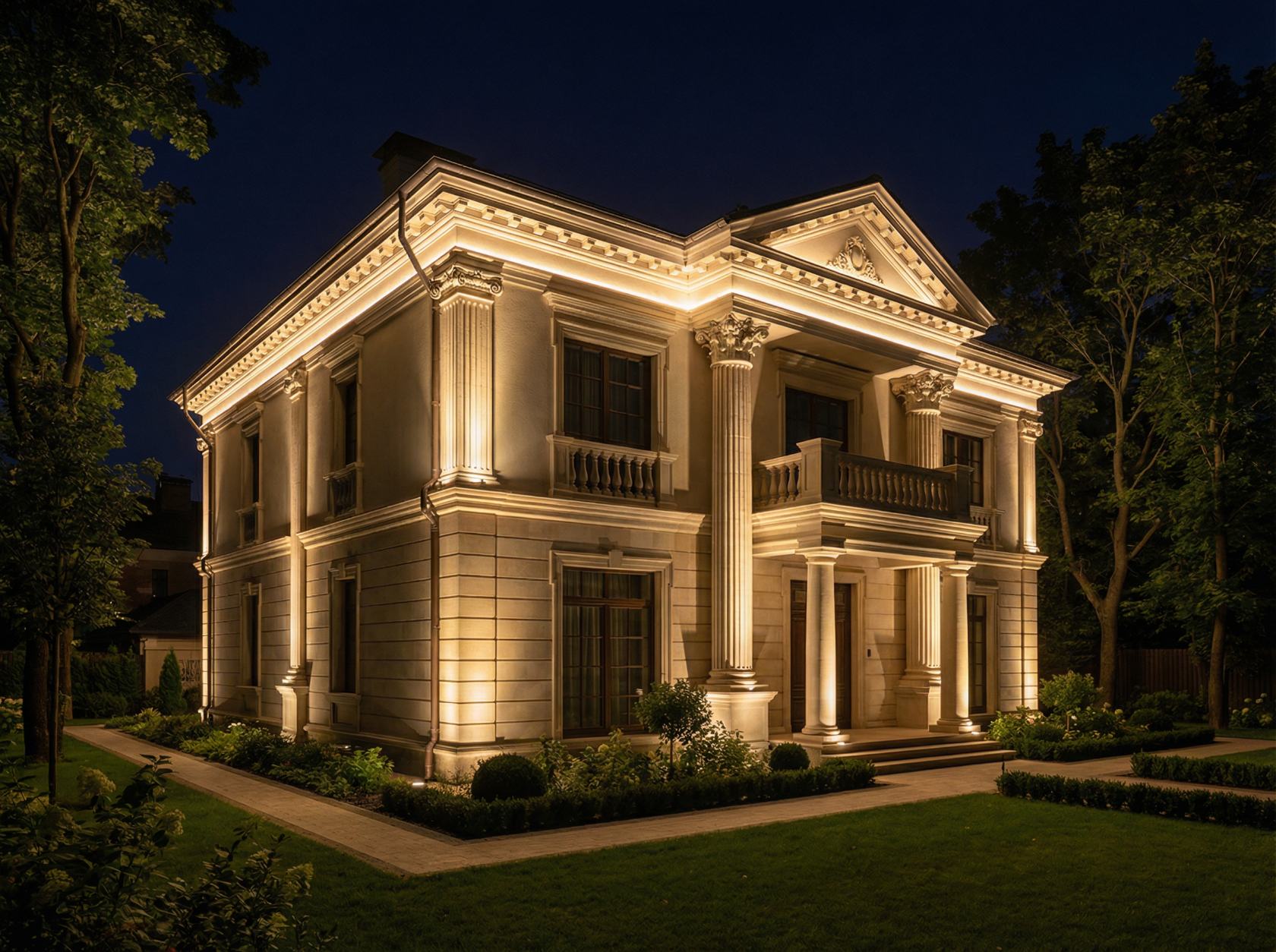 Световое решение: градационная подсветка снизу вверх с помощью грунтовых LED-прожекторов тёплой цветовой температуры (2700K). Колонны выделены направленными спотами. Карниз подсвечен линейными LED-лентами, создающими мягкий контур.