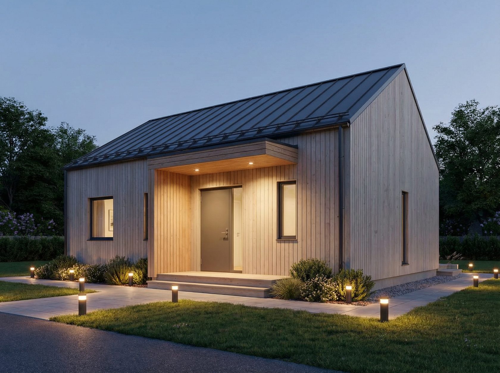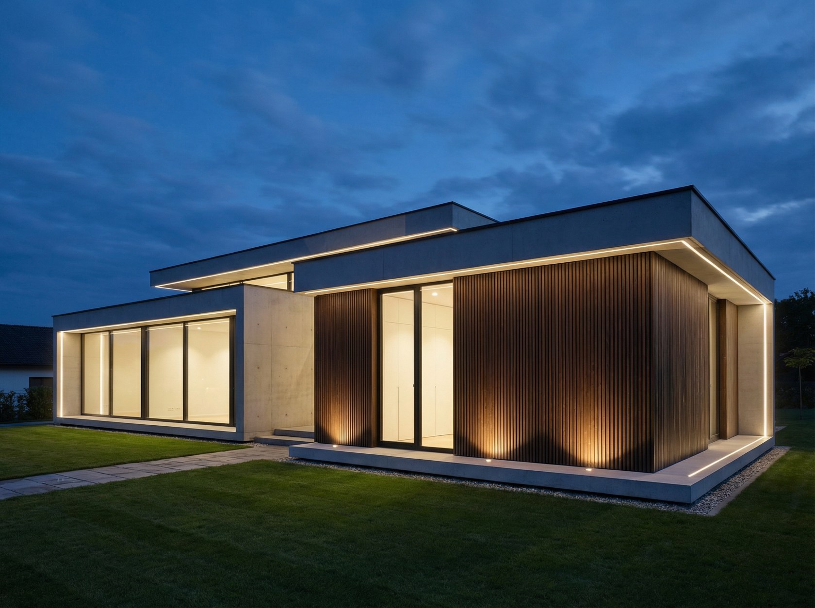 Эффект: дом выглядит графично, современно, свет подчёркивает геометрию и материалы, создаётся ощущение лёгкости.