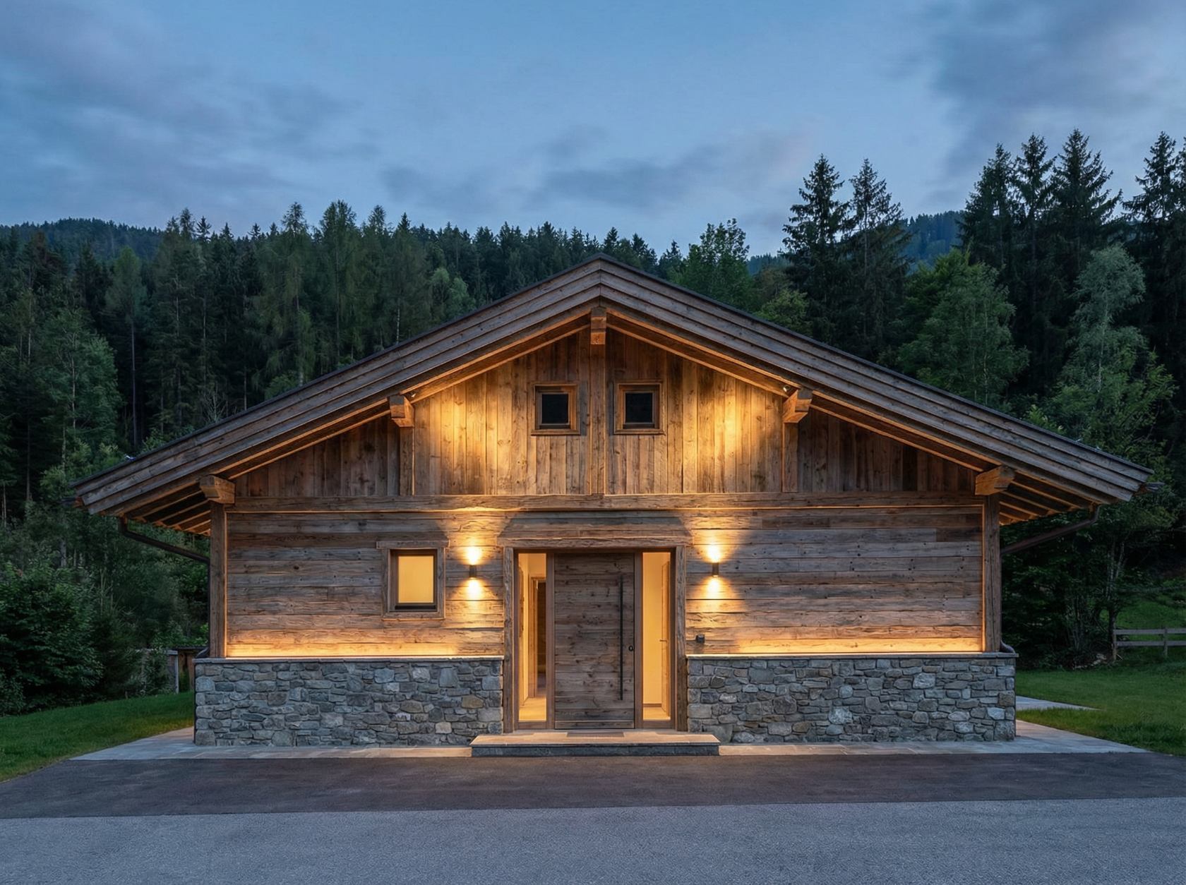 Эффект: дом выглядит уютно, естественно, свет не перебивает природный характер материалов.