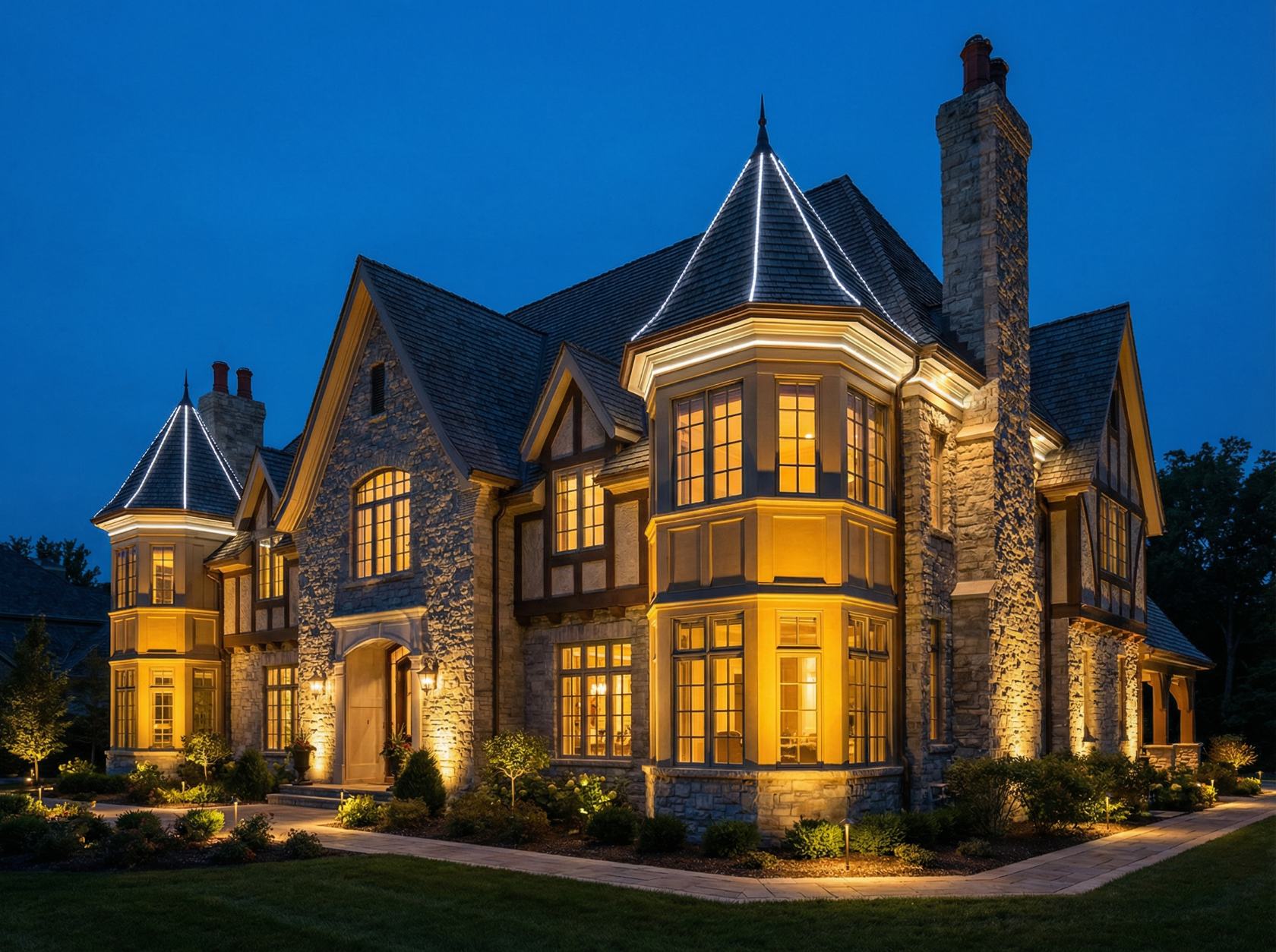 Световое решение: точечная подсветка ключевых элементов — эркер выделен направленными спотами снизу, башенка подсвечена по контуру LED-лентой, основной фасад освещён грунтовыми светильниками.