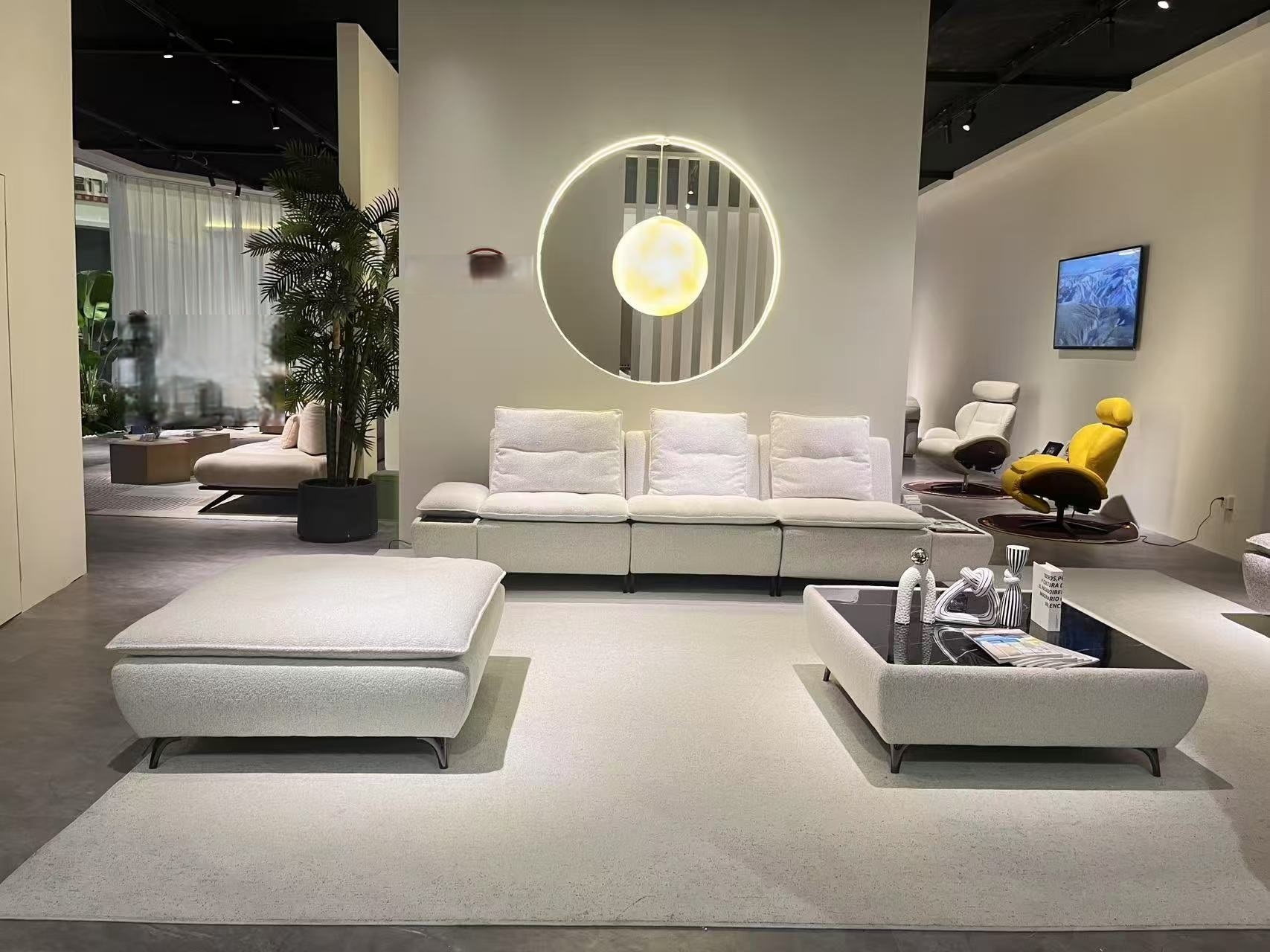 Диван позволяет менять наклон спинки и поднимать подножку до полулежащего положения. Пульт управления в комплекте.