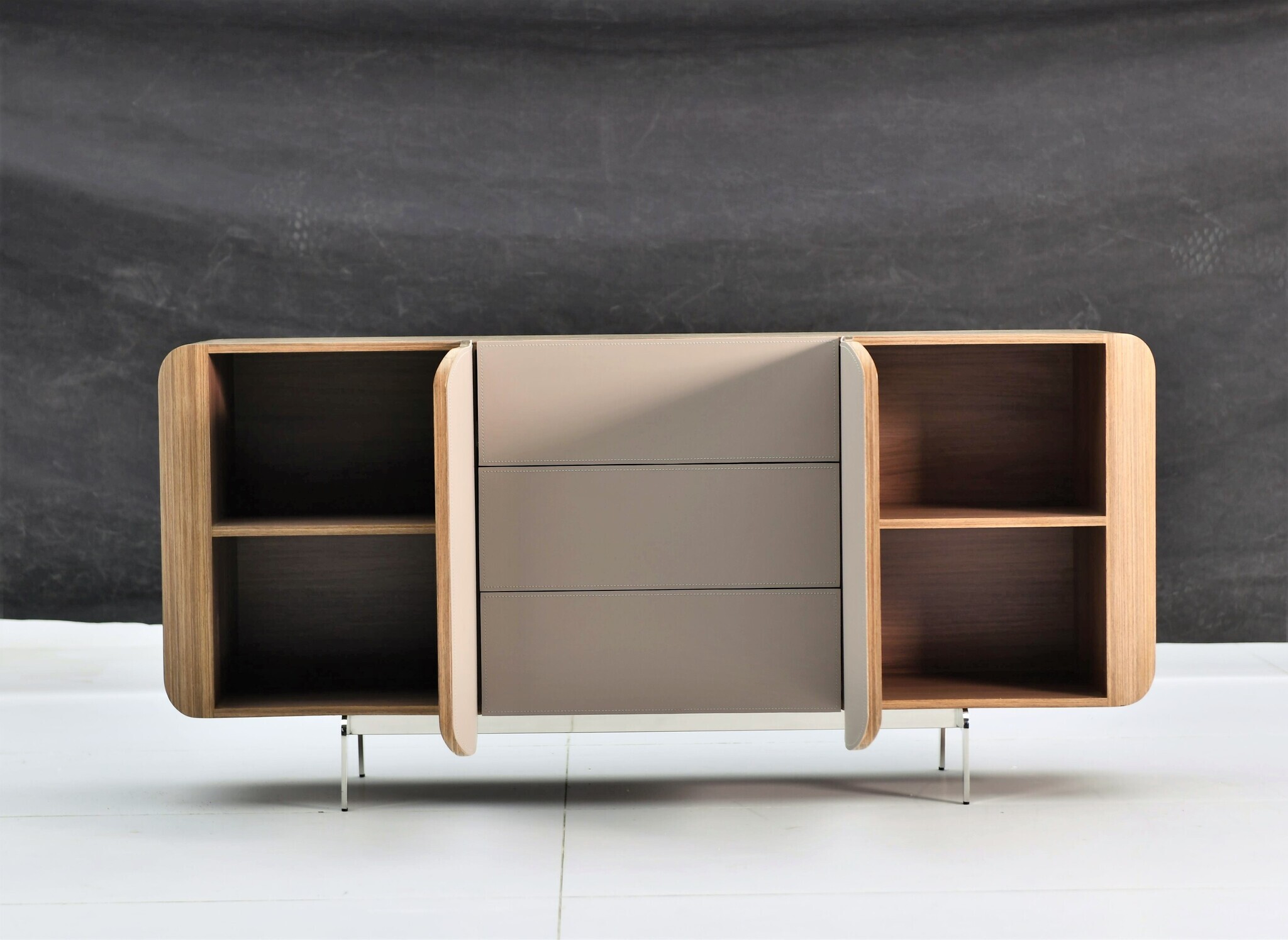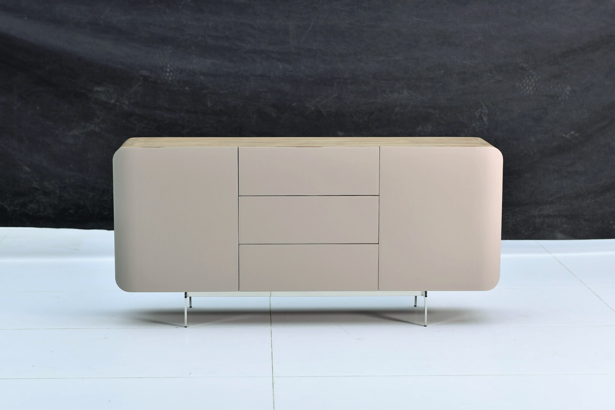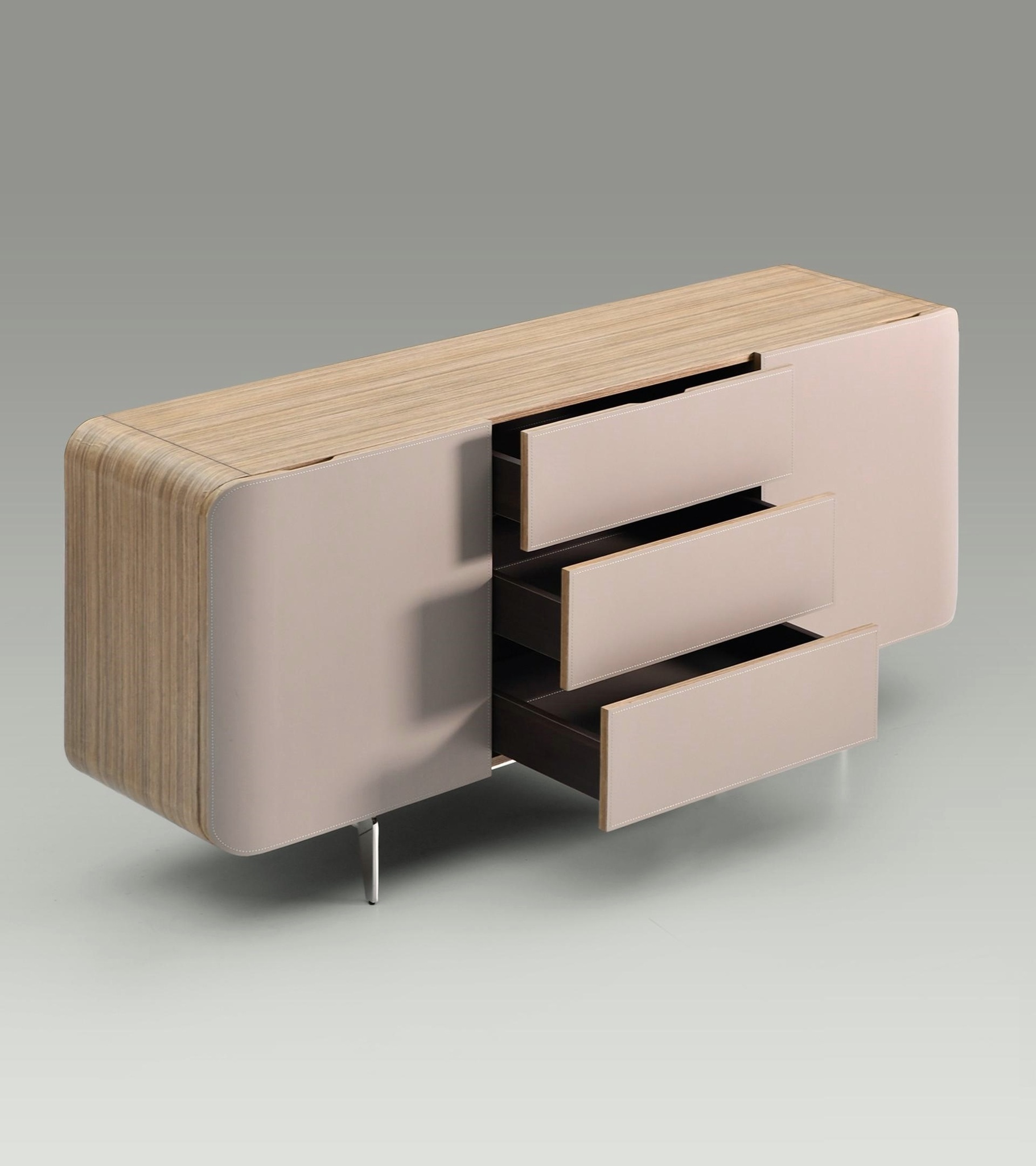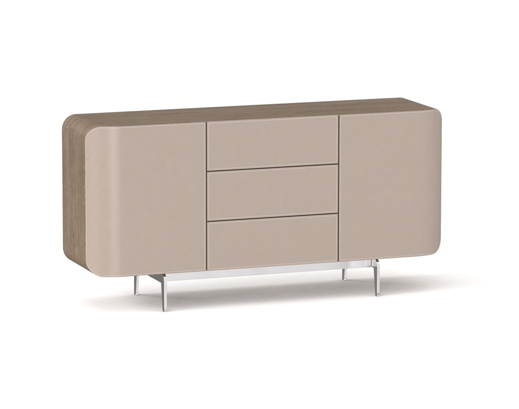 Комод представляет собой комбинацию распашных дверей с выдвижными ящиками. Ручки интегрированы в фасад дверей. Три ящика со скрытой системой крепления и доводчиками.