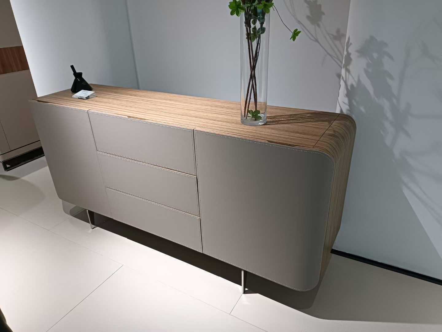 Комод в отделке из экокожи и шпона американского ореха. Ножки из металла. Цвет сатин.